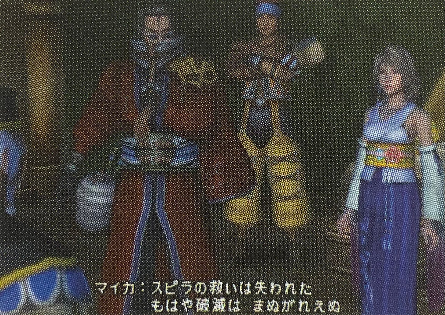 (There is a screenshot of Maester Mika addressing the party. The subtitles read: “Mika: Spira has lost its only hope. Destruction is inevitable.” A caption reads: “Many were possessed with power and greed, but at least Mika was solidifying the foundations of the Temple for Spira’s sake.”)